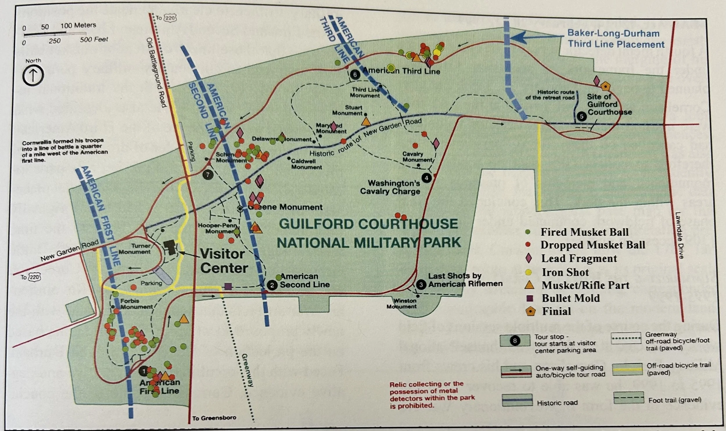 This is the fifth post in a series on the placement of the third line of battle at Guilford Courthouse. The series began with “Hunting Creek,” and continued through “Brandon,” “Durham,” and “Taylor.” The matter may be stated plainly: the archaeology conducted at the park strongly supports the original third line placement. There is, in fact, a complete absence of archaeological support for placing the third line east of Hunting Creek.