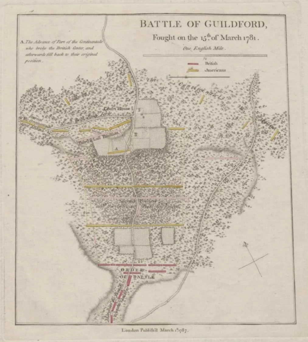 This page continues the discussion of the placement of the third line of battle at Guilford Courthouse, begun on the page entitled “Hunting Creek.” I take issue with the second reconstruction, specifically its placement of the third line of battle on the east side of Hunting Creek. This was an error; the third line stood on the western bank.