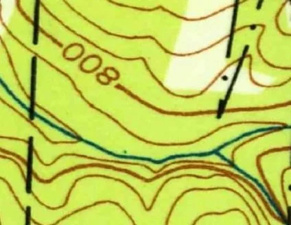 The above is a view of the same land on a modern topographic map. The orientation is the same, and Hunting Creek is the stream in the middle of the picture. The comparison is obvious: the land on the eastern bank of the creek recedes eastward as it moves north. There are other points, equally obvious. First, there is no landform matching the two-lobed hill in Tarleton’s depiction of the area. Second, the steep cliffs on the western bank of the creek match absolutely nothing on Tarleton’s map. Once more, we see that the map was at best a sketch, but more to the point here, it was a sketch of another piece of terrain.